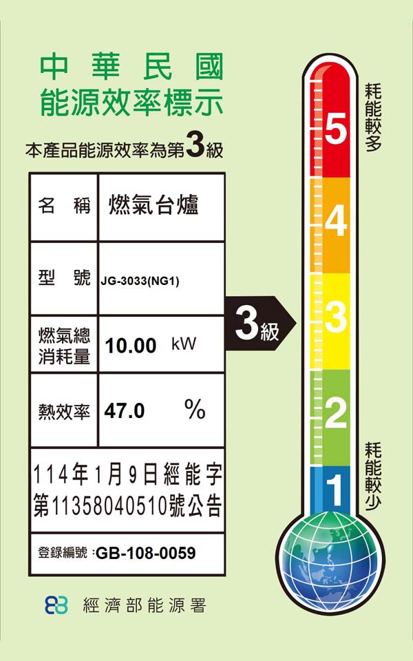 • 全銅專利燄火爐頭、熱效率達45%以上。